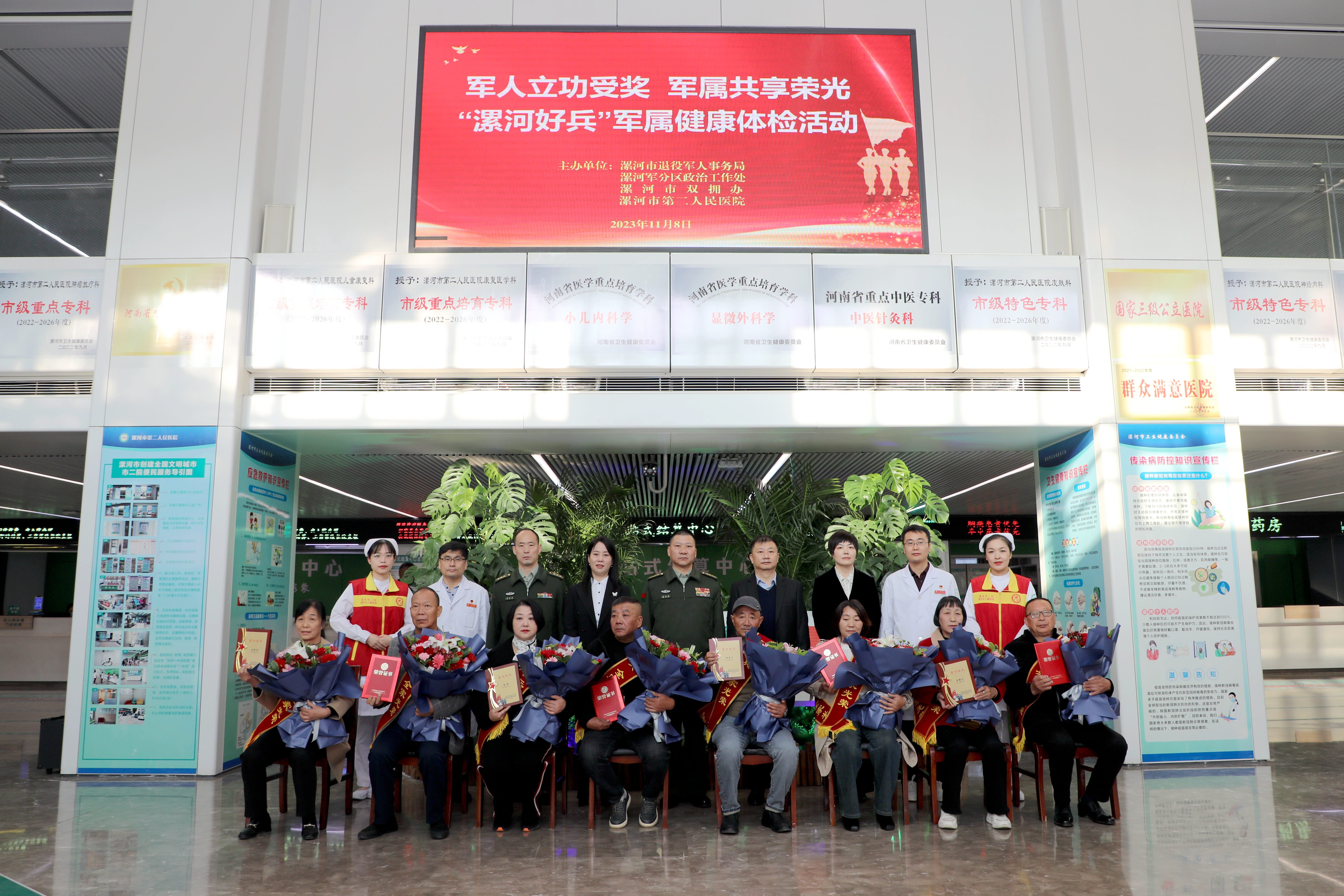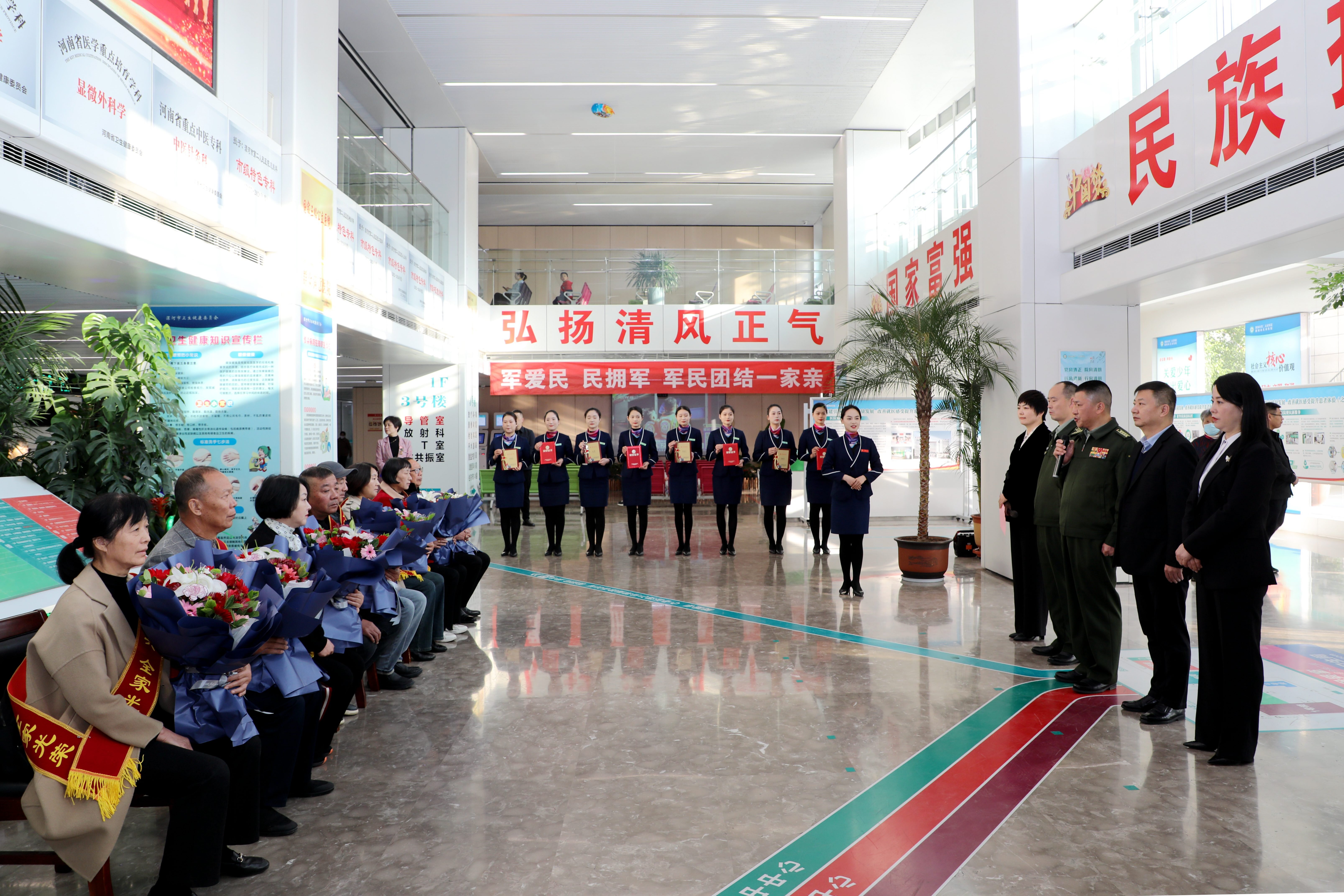 活動中,陳先勝司令員、魏松書記、李世偉主任、彭曉君主任分別向4名“漯河好兵”家屬獻(xiàn)上了鮮花和證書,并與市二院醫(yī)護(hù)代表共同和家屬合影留念。