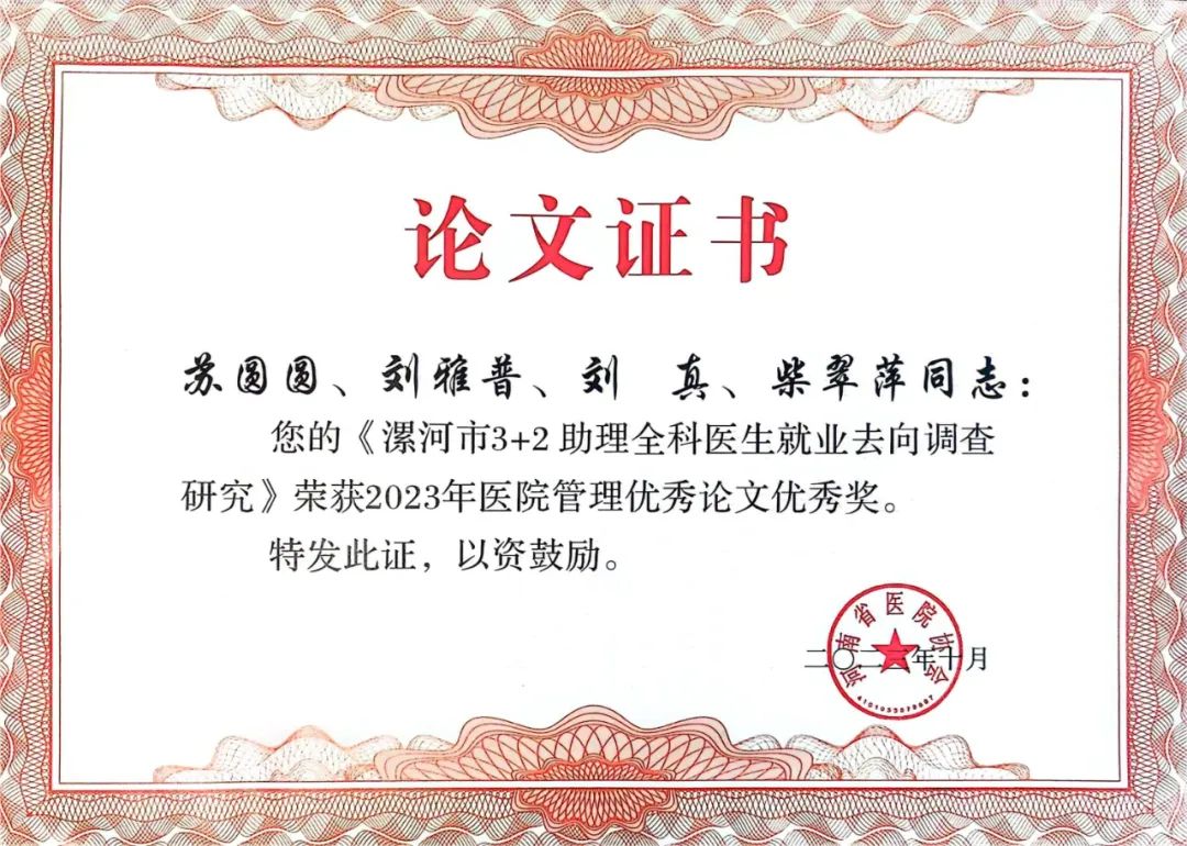 由蘇圓圓、劉雅普、劉真、柴翠萍共同完成的《漯河市3+2助理全科醫(yī)生就業(yè)去向調(diào)查研究》被授予2023年醫(yī)院管理優(yōu)秀論文優(yōu)秀獎。