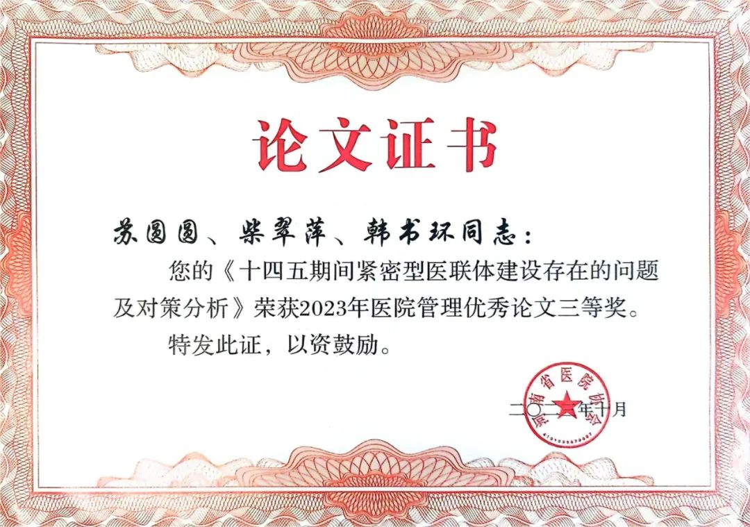 由蘇圓圓、柴翠萍、韓書環(huán)共同完成的《十四五期間緊密型醫(yī)聯(lián)體建設(shè)存在的問題及對策研究》被授予2023年醫(yī)院管理優(yōu)秀論文三等獎。