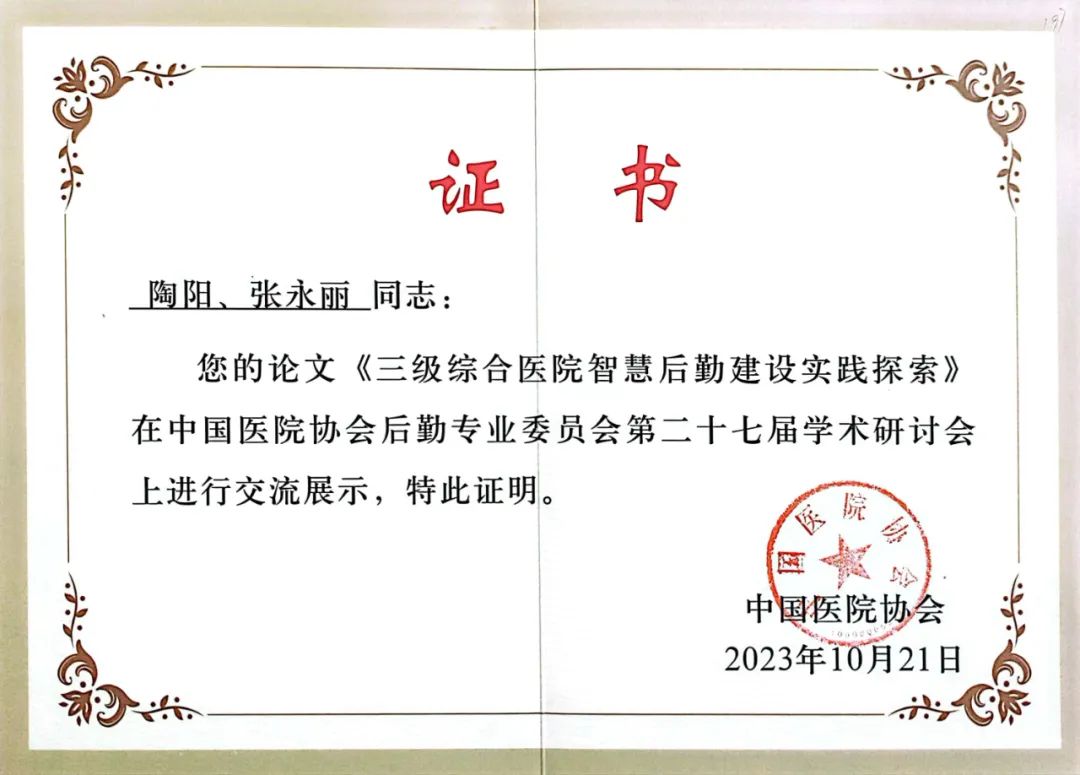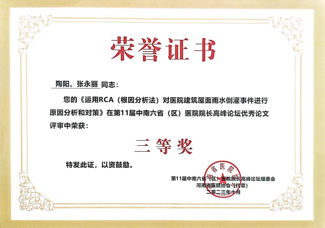 醫(yī)院總務(wù)科陶陽、張永麗共同完成的《三級綜合醫(yī)院智慧后勤建設(shè)實踐探索》論文被河南省醫(yī)院協(xié)會授予2023年醫(yī)院管理優(yōu)秀論文二等獎,被第11屆中南六?。▍^(qū))醫(yī)院院長高峰論壇組委會及河南省醫(yī)院協(xié)會共同授予優(yōu)秀論文三等獎。以及《運(yùn)用RCA(根因分析法)對醫(yī)院建筑屋面雨水倒灌事件進(jìn)行原因分析和對策》被授予2023年醫(yī)院管理優(yōu)秀論文二等獎,進(jìn)一步被推送到中國醫(yī)院協(xié)會后勤專業(yè)委員會第二十七屆學(xué)術(shù)研討會上進(jìn)行學(xué)術(shù)交流。