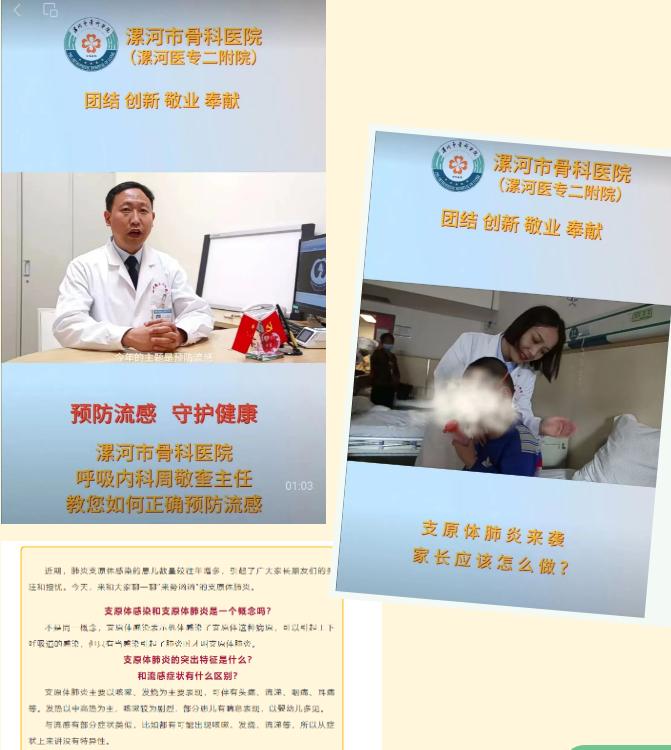 入秋以來(lái)呼吸道疾病高發(fā),醫(yī)院結(jié)合日常工作經(jīng)驗(yàn),不斷加強(qiáng)公眾教育和健康宣傳。邀請(qǐng)兒科、呼吸內(nèi)科等科室的多位專(zhuān)家錄制科普視頻,并利用視頻號(hào)、抖音號(hào)等多平臺(tái)向公眾發(fā)布健康宣教知識(shí)。同時(shí),向各科室征集健康科普文章,通過(guò)漯河市骨科醫(yī)院微信公眾平臺(tái)及省市級(jí)媒體進(jìn)行發(fā)布,多渠道向公眾普及兒童常見(jiàn)疾病的預(yù)防和治療知識(shí),為支原體肺炎的預(yù)防和應(yīng)急處理提供支持,提高家長(zhǎng)們的健康意識(shí)和應(yīng)對(duì)能力。