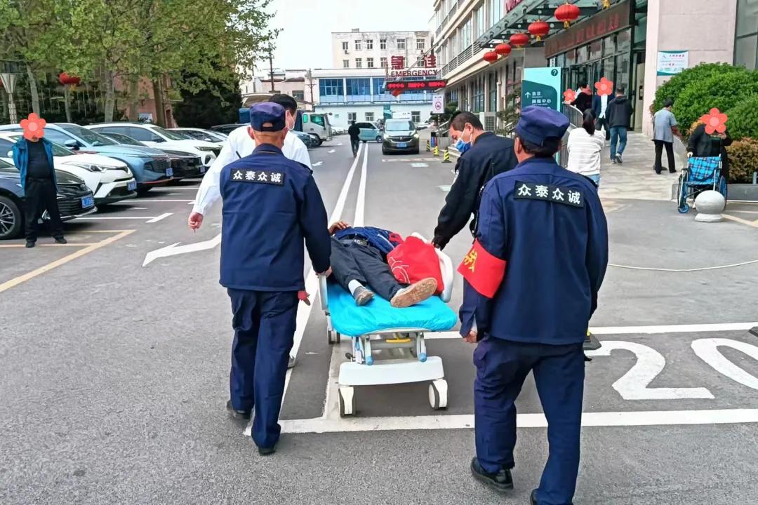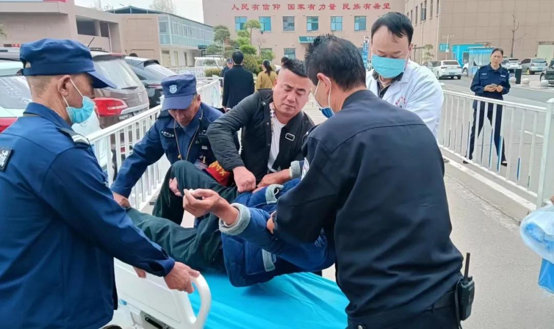 班長(zhǎng)王收首先利用醫(yī)院保衛(wèi)科“點(diǎn)對(duì)點(diǎn)”的安保設(shè)置,通知急診醫(yī)學(xué)科駐點(diǎn)的安保人員,及時(shí)與急診醫(yī)務(wù)人員取得聯(lián)系;同時(shí),安保隊(duì)員李文超等人迅速趕到,幫助急診科住院醫(yī)師王英杰一起,將平車推往現(xiàn)場(chǎng);聞?dòng)嵹s來的賈俊杰隊(duì)長(zhǎng)冷靜指揮,多名隊(duì)員合力將患者搬上了平車,并迅速轉(zhuǎn)移至急診搶救室。