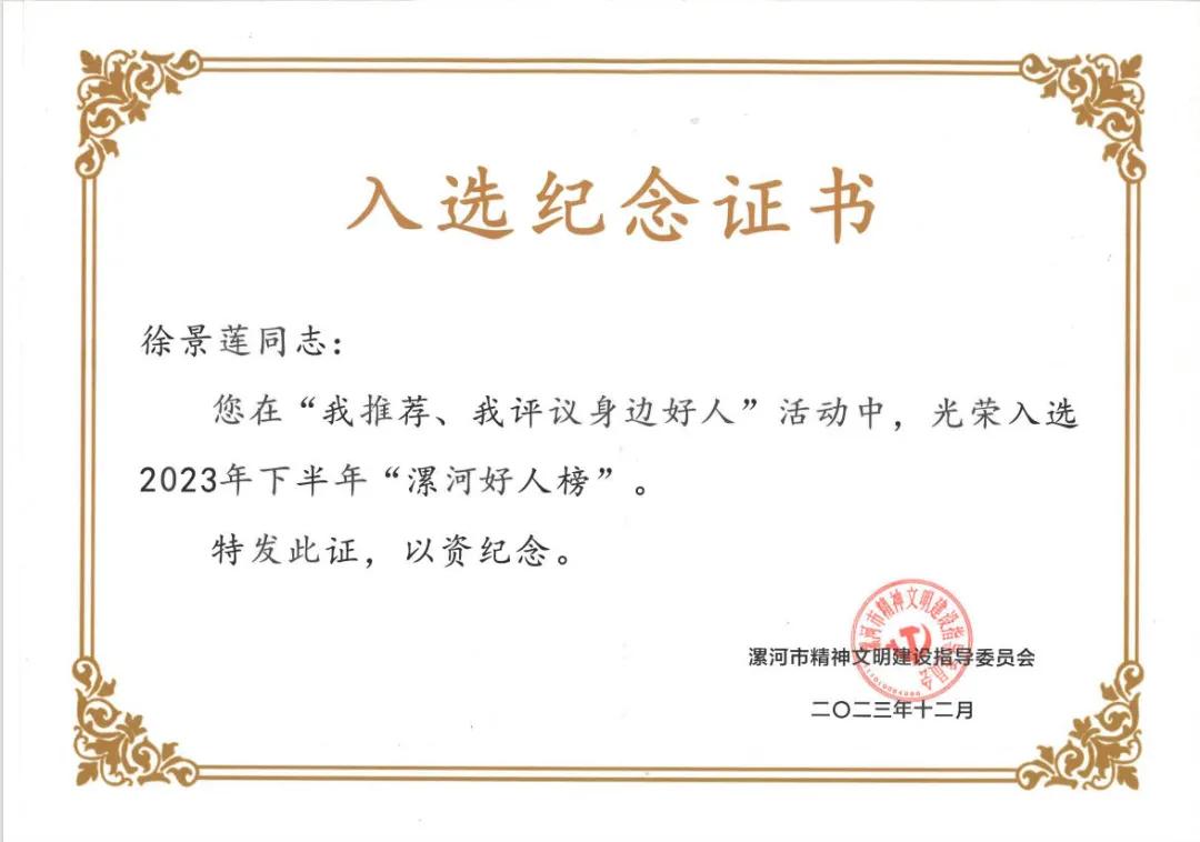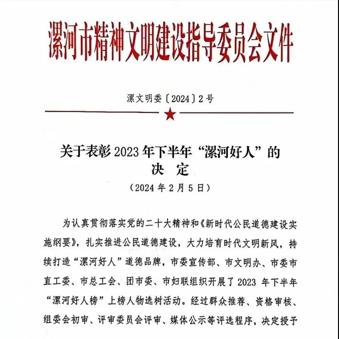 為認(rèn)真貫徹落實(shí)黨的二十大精神和《新時(shí)代公民道德建設(shè)實(shí)施綱要》,扎實(shí)推進(jìn)公民道德建設(shè),大力培育時(shí)代文明新風(fēng),持續(xù)打造“漯河好人”道德品牌,市委宣傳部、市文明辦、市委市直工委、市總工會(huì)、團(tuán)市委、市婦聯(lián)組織開展了2023年下半年“漯河好人榜”上榜人物選樹活動(dòng)。經(jīng)過群眾推薦、資格審核、組委會(huì)初審、評(píng)審委員會(huì)評(píng)審、媒體公示等評(píng)選程序,共12人上榜。