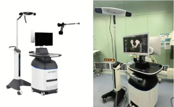 髖關(guān)節(jié)手術(shù)機器人由主控操作系統(tǒng)臺車、光學(xué)追蹤系統(tǒng)臺車、腳踏開關(guān)、手持動力系統(tǒng)及手術(shù)器械工具包組成。