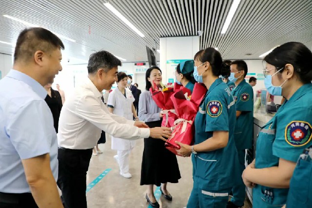 8月19日,是第七個(gè)中國(guó)醫(yī)師節(jié),市衛(wèi)健委黨組書(shū)記、主任宋耀生,副主任、三級(jí)調(diào)研員于宏,辦公室主任何翔,醫(yī)政科長(zhǎng)王彩紅一行蒞臨市二院,看望慰問(wèn)奮戰(zhàn)在一線廣大醫(yī)務(wù)工作者。黨委書(shū)記魏松,院長(zhǎng)王瑾及班子成員和相關(guān)職能部門(mén)人員陪同慰問(wèn)。