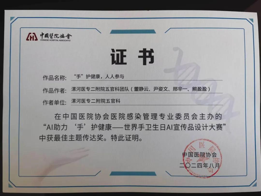 中國醫(yī)院協(xié)會(huì)醫(yī)院感染管理專業(yè)委員會(huì)特別舉辦了世界手衛(wèi)生日AI宣傳品設(shè)計(jì)大賽,旨在通過數(shù)字技術(shù)和人工智能為醫(yī)院感染防控培訓(xùn)與宣傳注入新的活力?;顒?dòng)共收到來自全國29個(gè)省/自治區(qū)/直轄市100座城市186家單位的384幅參賽作品,入圍40幅作品中河南省內(nèi)醫(yī)院有4所。我院五官科團(tuán)隊(duì)?wèi){借作品“手”護(hù)健康,人人參與,在眾多參賽作品中脫穎而出,9月1日在中國醫(yī)院協(xié)會(huì)第30屆全國醫(yī)院感染管理學(xué)術(shù)年會(huì)閉幕式、頒獎(jiǎng)儀式暨青年沙龍啟動(dòng)儀式上公布獲獎(jiǎng)名單,我院參賽作品獲得最佳主題傳達(dá)獎(jiǎng)中的最高分。由大會(huì)主席、中國醫(yī)院協(xié)會(huì)醫(yī)院感染管理專業(yè)委員會(huì)主任委員、北京大學(xué)第一醫(yī)院副院長李航及中國醫(yī)院協(xié)會(huì)醫(yī)院感染管理專業(yè)委員會(huì)副主任委員、國家醫(yī)院感染管理質(zhì)量控制中心專家、浙江大學(xué)醫(yī)學(xué)院附屬第二醫(yī)院感染管理科主任陸群為獲得最佳主題獎(jiǎng)的代表頒獎(jiǎng)。這一榮譽(yù)不僅是對(duì)創(chuàng)作團(tuán)隊(duì)創(chuàng)意與努力的肯定,更是對(duì)醫(yī)院整體實(shí)力、團(tuán)結(jié)協(xié)作精神的認(rèn)可。