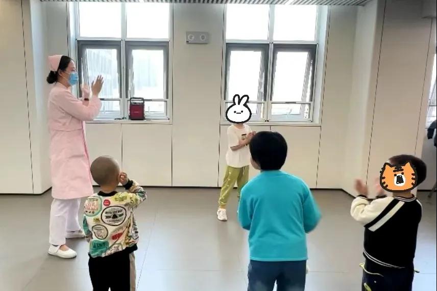 每天固定的時(shí)間和地點(diǎn)組織患兒與患兒家屬在七樓大廳做親子小律動(dòng)操,聽音樂做運(yùn)動(dòng),不僅可以鍛煉孩子的粗大運(yùn)動(dòng)的協(xié)調(diào)性;改善孩子們的溝通能力和集體活動(dòng)的參與性;歡快的音樂可以刺激神經(jīng)系統(tǒng)的興奮性,抑制低落情緒,緩解緊張、焦慮,有助于穩(wěn)定患兒情緒,促進(jìn)患兒身心康復(fù)。