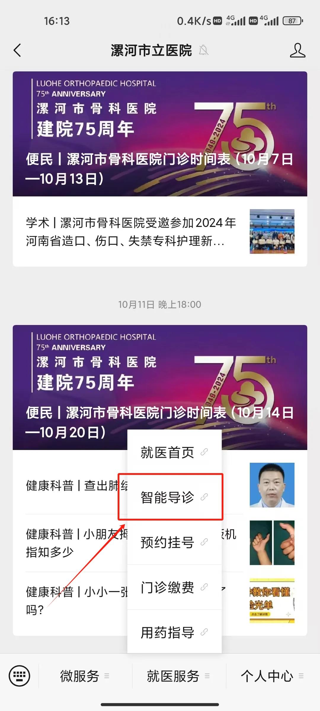 (1)關(guān)注微信公眾號點(diǎn)擊就醫(yī)首頁,進(jìn)入公眾號主頁,點(diǎn)擊智能導(dǎo)診;