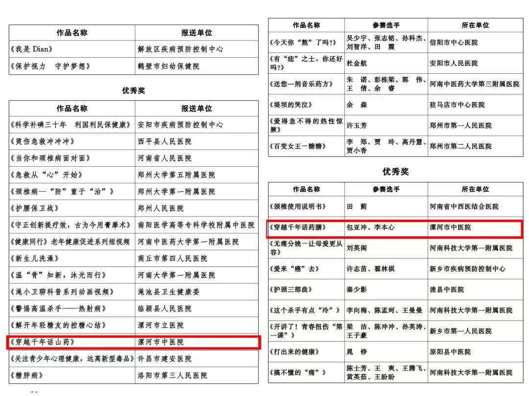 自3月28日以來,經(jīng)過初賽、分主題決賽、總決賽的激烈角逐,漯河市中醫(yī)院手術(shù)室主管護師包亞沖和外一科主治中醫(yī)師李本心共同創(chuàng)作的科普作品《穿越千年話藥膳》榮獲第六屆河南省健康科普技能大賽表演類優(yōu)秀獎,包亞沖創(chuàng)作的《穿越千年話山藥》榮獲第六屆河南省健康科普技能大賽科普作品視頻類優(yōu)秀獎。