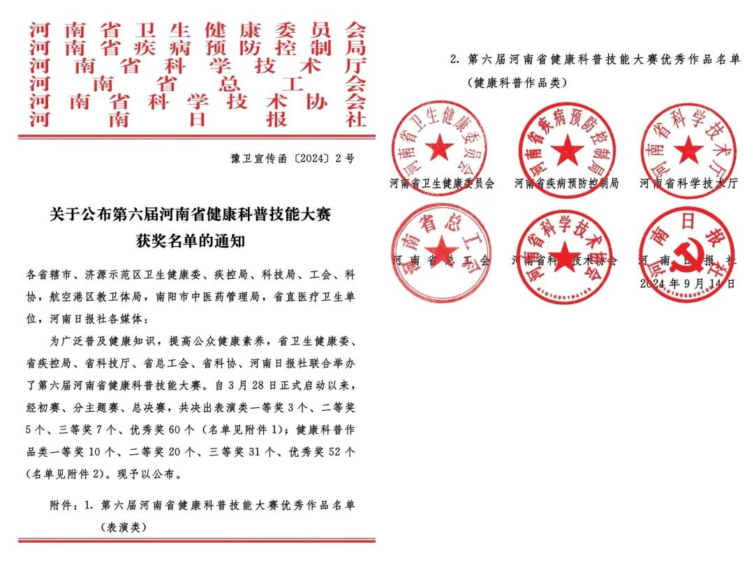近日,由河南省衛(wèi)生健康委、河南省疾病預(yù)防控制局、河南省科技廳、河南省總工會、河南省科協(xié)、河南日報社聯(lián)合主辦、河南省疾病預(yù)防控制中心、大河健康報聯(lián)合承辦的第六屆河南省健康科普技能大賽圓滿落下帷幕。