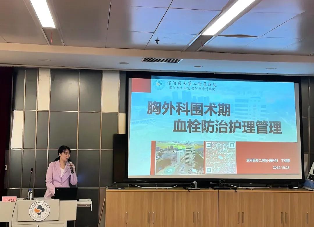 丁亞楠護(hù)士長(zhǎng)以《胸外科圍術(shù)期血栓防治護(hù)理管理》為題,講述胸外科血栓防治護(hù)理管理是確?;颊邍g(shù)期安全的重要環(huán)節(jié),需要貫穿患者術(shù)前、術(shù)中、術(shù)后及出院后的全過(guò)程,通過(guò)全面的評(píng)估、個(gè)性化的預(yù)防措施、密切的病情觀察和有效的抗凝治療手段,降低血栓形成的風(fēng)險(xiǎn),確保患者的安全。醫(yī)護(hù)不分家,醫(yī)療團(tuán)隊(duì)及護(hù)理團(tuán)隊(duì)的共同發(fā)展才能促進(jìn)??平ㄔO(shè)的發(fā)展,丁亞楠護(hù)士長(zhǎng)促使胸外護(hù)理團(tuán)隊(duì)的??平ㄔO(shè),對(duì)VTE的防治管理規(guī)范管理,為胸外的發(fā)展提供助力。