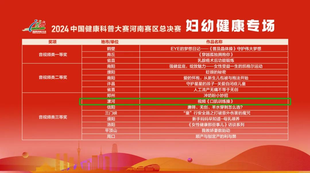 在大賽中,市二院憑借卓越表現(xiàn),原創(chuàng)作品《雙腿的控訴》獲得慢性病類作品三等獎(jiǎng)、《背包俠客》獲得婦幼健康類作品三等獎(jiǎng)、視頻作品《口肌訓(xùn)練操》獲得三等獎(jiǎng),為健康知識普及書寫了精彩篇章。