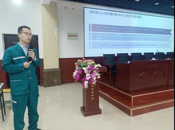 講座現(xiàn)場,馬彥輝為該校教職工科普心血管疾病相關知識,從冠心病的概況、癥狀與性質(zhì)、急性心肌梗死的形成以及ACS的急救措施等內(nèi)容進行了詳細講解。針對心血管疾病的危險因素,重點與在場人員分享了冠心病的預防措施,介紹了飲食健康、控制體重、定期運動、減輕生活壓力及戒煙限酒等對于降低心血管疾病風險的重要性。