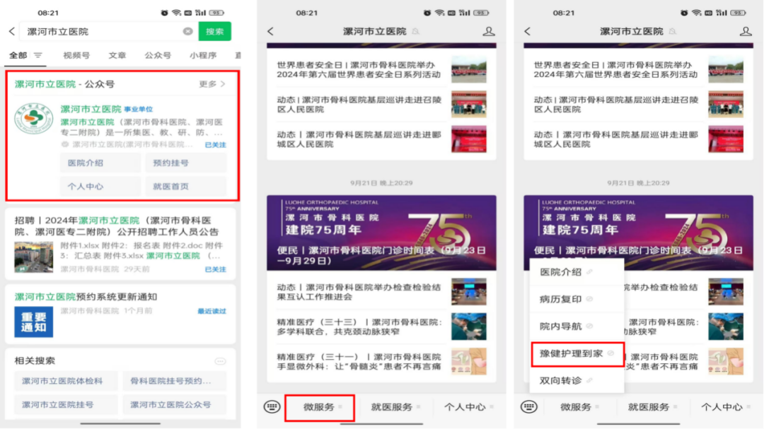 1.微信公眾號(hào)搜索“漯河市立醫(yī)院”,進(jìn)入公眾號(hào)點(diǎn)擊“微服務(wù)”,選擇“豫健護(hù)理到家”。