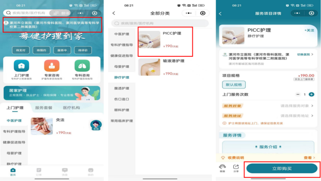 2.進(jìn)入后查看醫(yī)院是否正確,以下內(nèi)容以PICC護(hù)理為例:選擇PICC護(hù)理,點(diǎn)擊立即購(gòu)買(mǎi)。