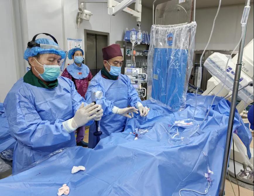 在這些患者中,一位正在消化內(nèi)科住院的超高齡老人格外引人關(guān)注。心電圖結(jié)合心肌酶結(jié)果顯示,該患者發(fā)生了急性非ST段抬高型心肌梗死,需要立即進(jìn)行介入手術(shù)治療?;颊咭咽?1歲高齡,這樣的年紀(jì)與身體狀況,發(fā)生心梗無疑是雪上加霜。由于老先生年齡過大,且伴有多種基礎(chǔ)疾病,手術(shù)的風(fēng)險極高。盡管困難重重,但心內(nèi)一科和消化內(nèi)科的醫(yī)護(hù)人員并沒有退縮——他們迅速啟動了胸痛綠色通道及危重患者搶救流程,科室聯(lián)手針對根據(jù)患者的身體狀況為其制定了個性化的介入手術(shù)治療方案。在手術(shù)過程中,陳建忠主任帶領(lǐng)宋松根副主任及團(tuán)隊?wèi){借著精湛的醫(yī)術(shù)和默契的配合,成功為患者實施了冠狀動脈造影及支架植入術(shù),打通了他堵塞的血管,又一次為年邁的老人點燃了生的希望。