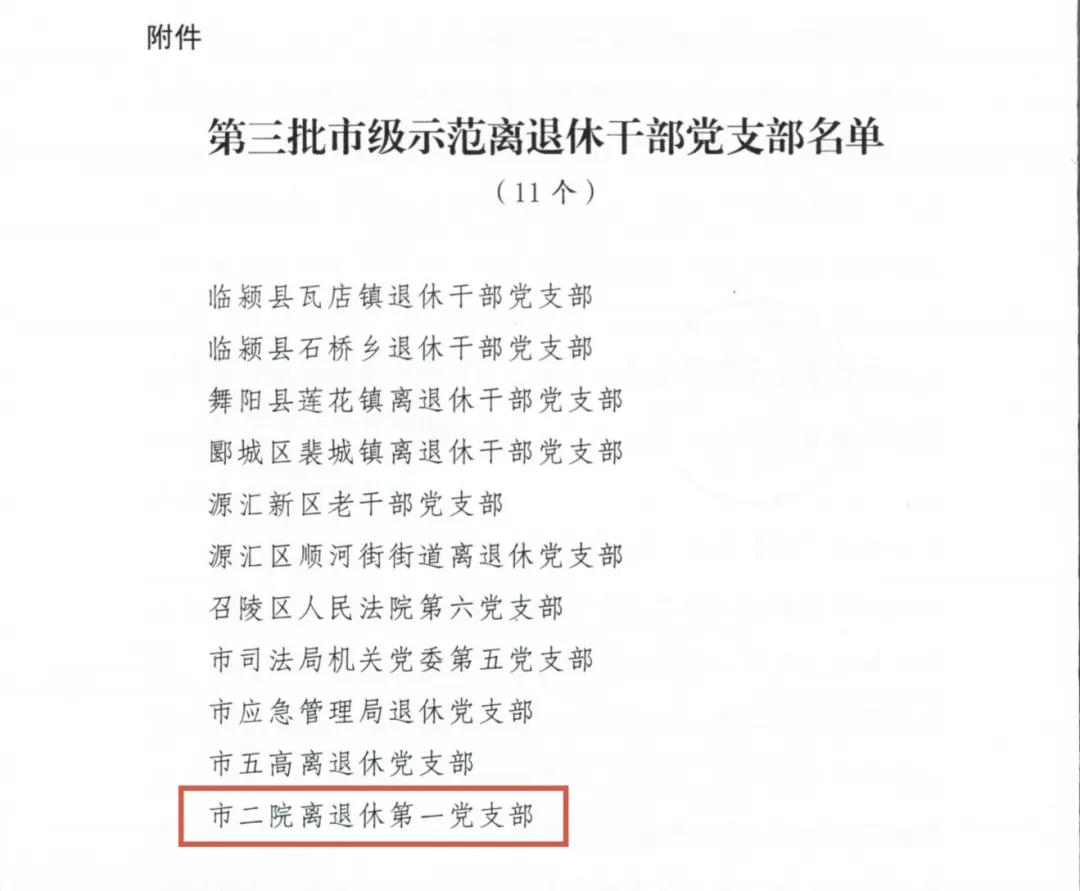 近日,市委組織部、市委老干部局印發(fā)了《關(guān)于命名第三批市級(jí)示范離退休干部黨支部的決定》(漯老〔2024〕32號(hào)),市二院離退休第一黨支部被評(píng)為第三批市級(jí)示范離退休干部黨支部,同時(shí)也是漯河市衛(wèi)生健康系統(tǒng)唯一受到表彰命名的單位。