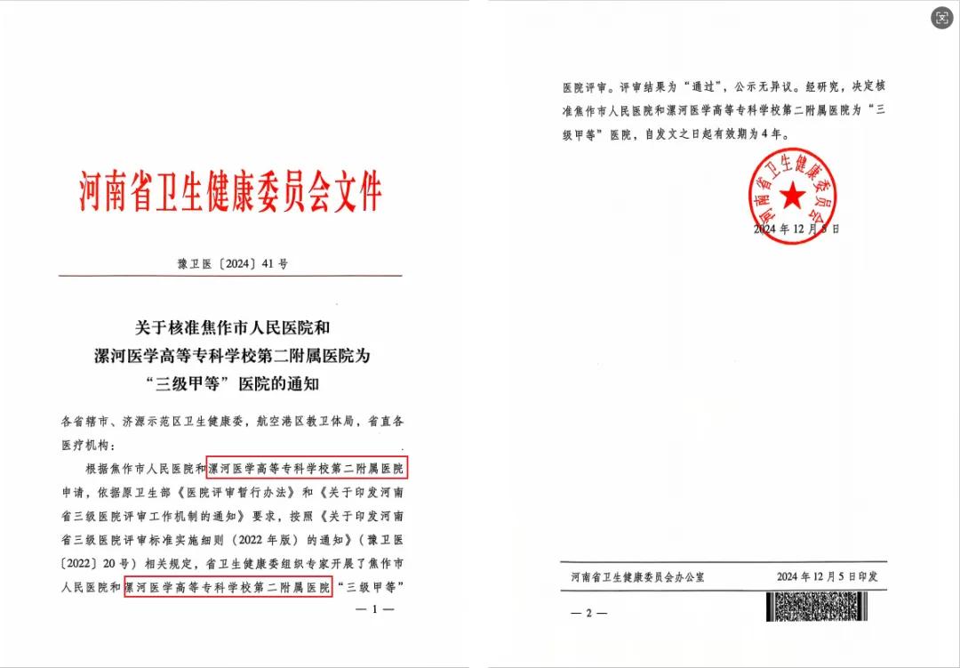 從1949年到2024年,漯河醫(yī)專(zhuān)第二附屬醫(yī)院(漯河市骨科醫(yī)院、漯河市立醫(yī)院)走過(guò)了75載不平凡的發(fā)展歷程。時(shí)值醫(yī)院建院75周年之際,喜報(bào)傳來(lái):經(jīng)河南省衛(wèi)生健康委“三級(jí)甲等醫(yī)院”評(píng)審和公示,決定核準(zhǔn)漯河醫(yī)學(xué)高等專(zhuān)科學(xué)校第二附屬醫(yī)院為“三級(jí)甲等”醫(yī)院!