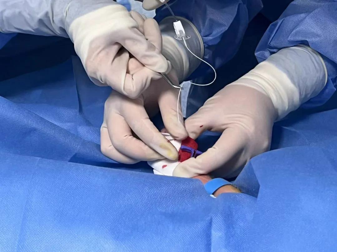 下午 16點,在護理部副主任曹慧芳的指導下,兒科李紅護士長與趙曙光精心進行置管前準備,血液凈化室呂春曉護士長和腫瘤血液科于楊波護士長全力協(xié)助,每一個細節(jié)都彰顯著團隊的默契與協(xié)作。醫(yī)護人員全神貫注地為小天使進行 PICC 置管穿刺。他們的每一個動作都精準而溫柔,仿佛在雕琢一件稀世珍寶,因為我們深知,這是守護新生命的關(guān)鍵一步。