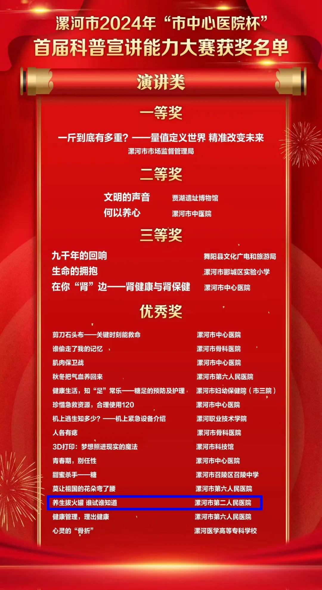 12月18日,由中共漯河市委宣傳部、中共漯河市委人才工作領(lǐng)導(dǎo)小組辦公室、漯河市科學(xué)技術(shù)協(xié)會(huì)、漯河市衛(wèi)生健康委員會(huì)聯(lián)合主辦,漯河市中心醫(yī)院冠名,漯河日?qǐng)?bào)社承辦的漯河市2024年“市中心醫(yī)院杯”首屆科普宣講能力大賽決賽落下帷幕。經(jīng)過激烈角逐,市二院精心選送的參賽作品由劉橋、李媛、安自譚、袁泉、任崢崢出演的《心臟“出走”記》榮獲舞臺(tái)表演類二等獎(jiǎng);由井紅鴿、李靜麗、鄭家珍、丁歡歡、程亞麗出演的《此“盆”非彼“盆”》榮獲舞臺(tái)表演類三等獎(jiǎng);另有四個(gè)參賽作品榮獲優(yōu)秀獎(jiǎng)。
