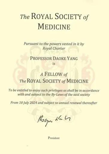英國皇家醫(yī)學(xué)會是世界上歷史悠久、具有影響力的醫(yī)學(xué)學(xué)術(shù)組織之一,致力于推動醫(yī)學(xué)科學(xué)的發(fā)展,提升全球醫(yī)療服務(wù)水平。該學(xué)會院士頭銜授予在醫(yī)學(xué)領(lǐng)域取得了突出成就的醫(yī)師和科學(xué)家。能夠當(dāng)選為英國皇家醫(yī)學(xué)會院士,是對楊道科教授學(xué)術(shù)成就和重要貢獻(xiàn)的高度認(rèn)可。