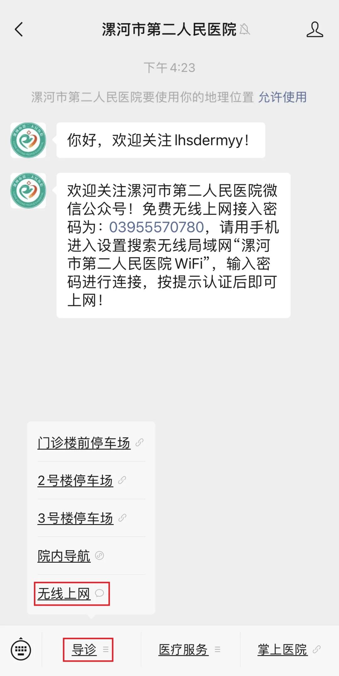 2. 關(guān)注市二院公眾號(hào)后,點(diǎn)導(dǎo)診--無線上網(wǎng)獲取上網(wǎng)密碼。