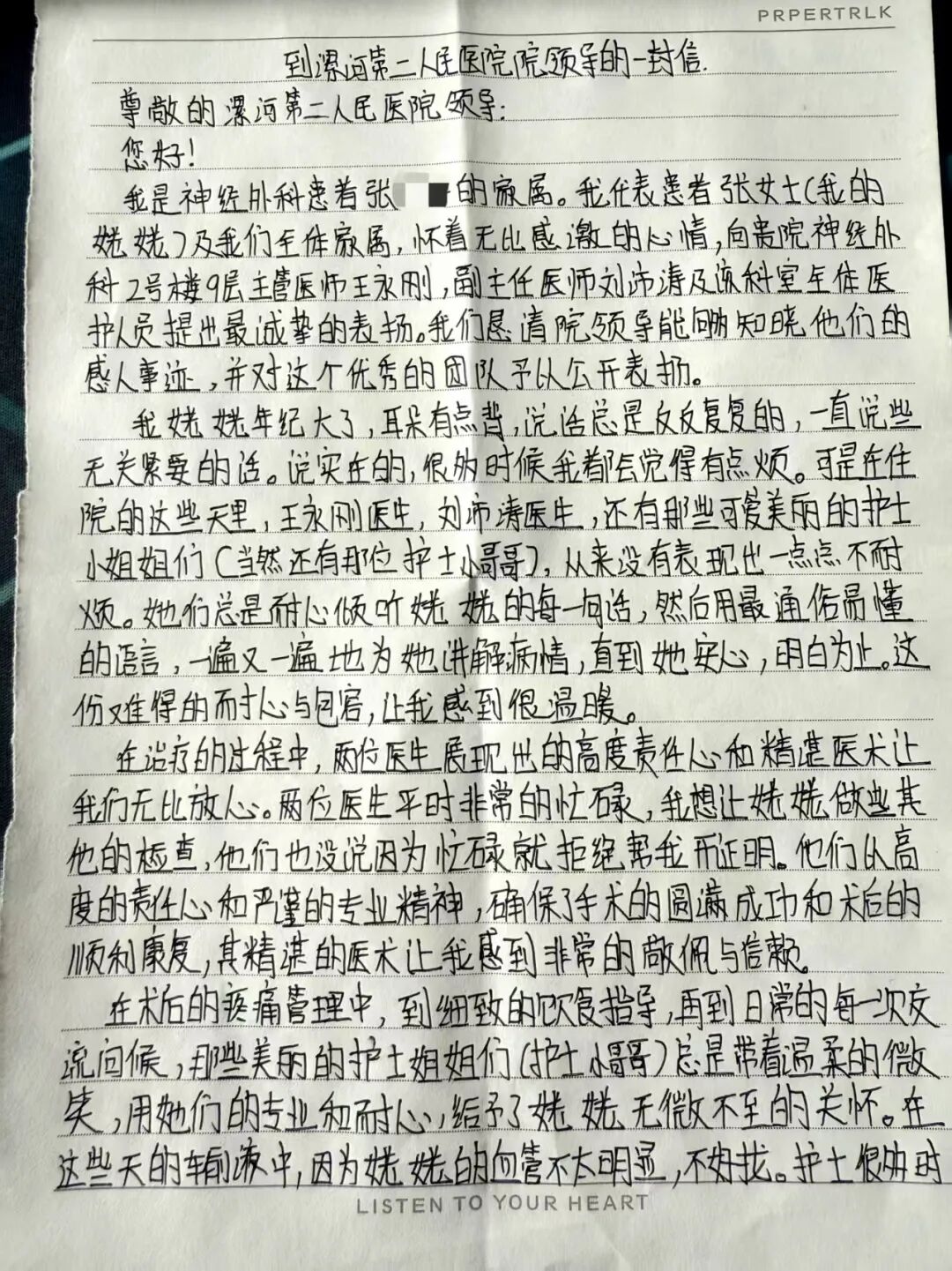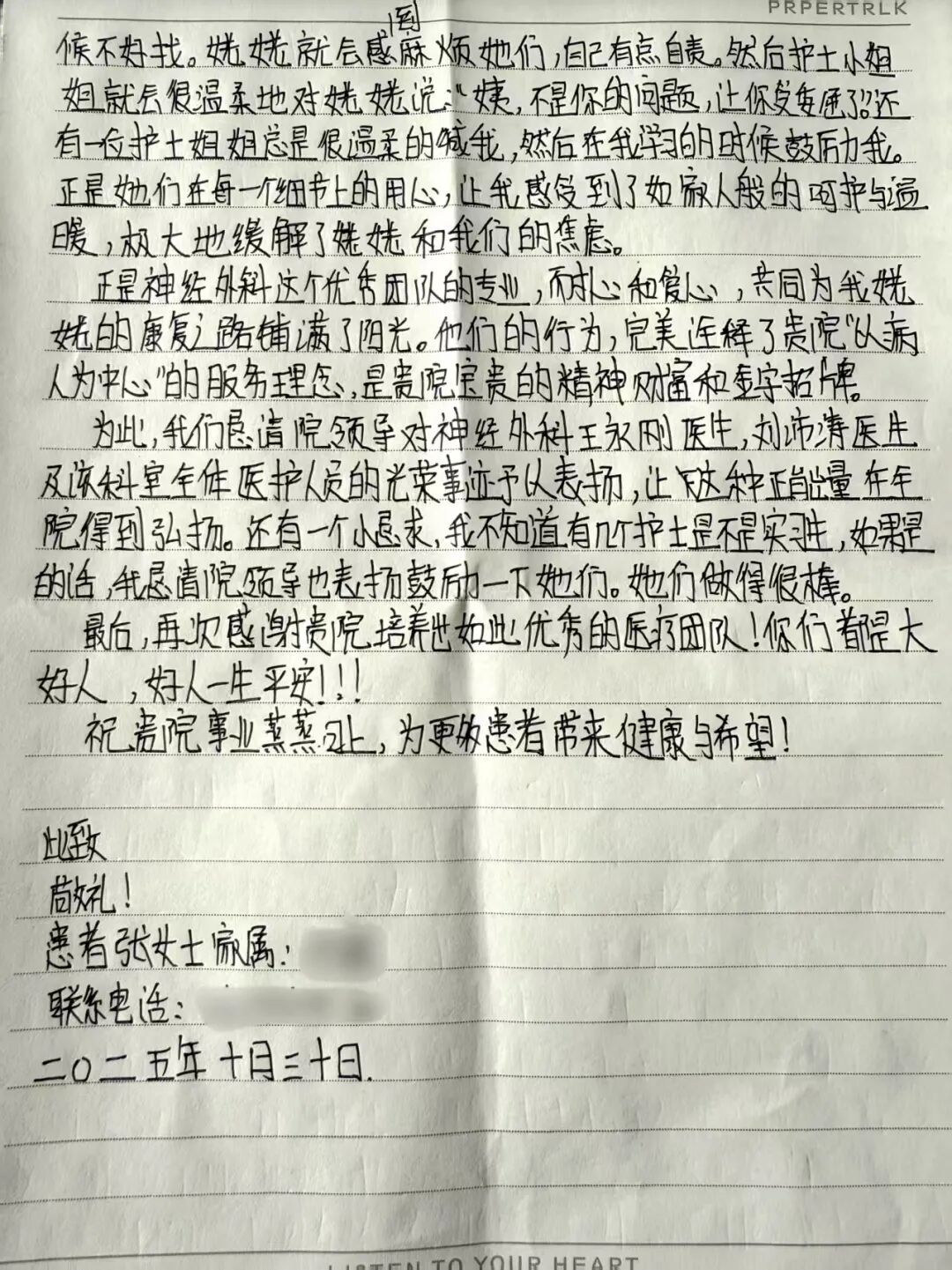 據(jù)了解,張女士的姥姥因“背部腫物”一直備受困擾,6年前在其他醫(yī)院手術(shù)治療后效果不佳,1年內(nèi)復(fù)發(fā),腫物逐漸增大,并出現(xiàn)肩部活動受限伴肩部疼痛。來到市二院后神經(jīng)外科醫(yī)生立即進(jìn)行手術(shù),因術(shù)中腫物與周圍組織粘連嚴(yán)重,手術(shù)歷時近2個小時,術(shù)后恢復(fù)良好。“我的姥姥年紀(jì)大了,耳朵有點背,說話總是反反復(fù)復(fù),啰啰嗦嗦的。說實在的,有時候我都會覺得有點煩??墒菑淖≡阂詠恚瑒⑴鏉魅?、王永剛醫(yī)生,還有那些美麗可愛的護(hù)士小姐姐們和帥氣的護(hù)士小哥哥,從來沒有表現(xiàn)出一點點不耐煩。他們總是耐心地聽姥姥講,一遍遍地解釋給她聽,直到她聽懂為止。”張女士的表揚信中字里行間包含著對神經(jīng)外科整個醫(yī)護(hù)團(tuán)隊暖心服務(wù)的認(rèn)可與贊美。