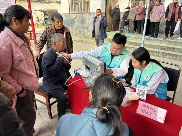 活動現(xiàn)場,漯河醫(yī)專二附院各科醫(yī)療專家志愿者熟練操作便攜式診療設備,有序的為當?shù)卮迕衩赓M測量血壓、手指血糖、甲狀腺彩超、骨密度檢測、眼底篩查、體格檢查、用藥指導、健康咨詢、疾病診斷等。面對前來就診的群眾,專家們耐心傾聽村民的病情描述,細致詢問既往病史、用藥情況,結合專業(yè)檢查給出精準診斷,同時圍繞常見慢性病管理、冬季傳染病預防、合理用藥等知識,發(fā)放宣傳手冊,用通俗易懂的語言為村民答疑解惑。