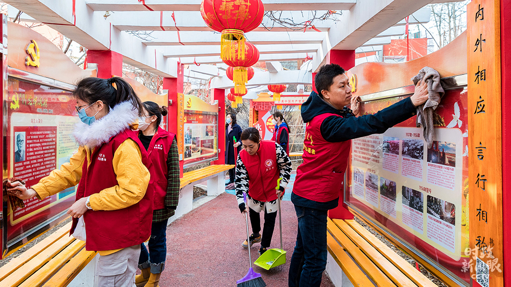 △2021年3月4日,內(nèi)蒙古呼和浩特市玉泉區(qū)的黨員干部、青年志愿者在清泉街社區(qū)黨建文化長(zhǎng)廊內(nèi)打掃衛(wèi)生。