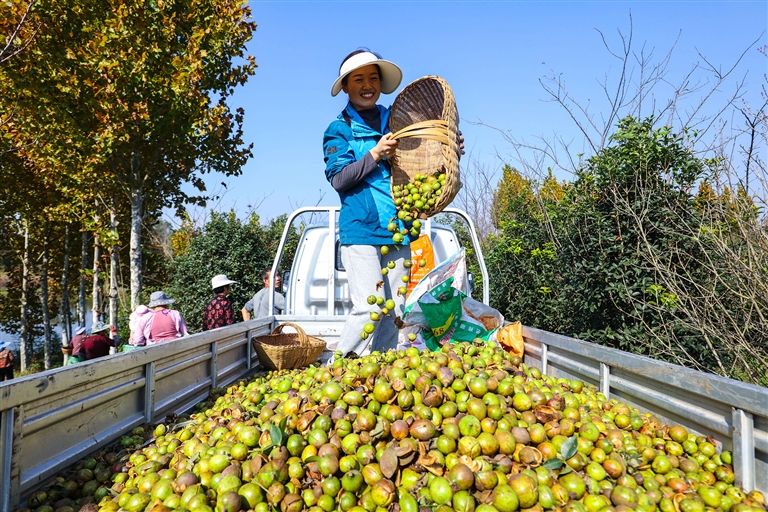 10月28日,光山縣涼亭鄉(xiāng)王灣村新天地合作社油茶種植基地,農(nóng)民正在把采摘的油茶果裝車。近年來(lái),當(dāng)?shù)貓?jiān)持“企業(yè)+基地+農(nóng)戶”的發(fā)展模式,把油茶產(chǎn)業(yè)作為富民特色產(chǎn)業(yè),推廣新技術(shù),發(fā)展深加工。謝萬(wàn)柏 攝
