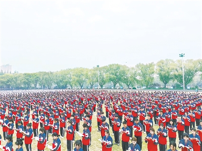 圖為漯河職業(yè)技術學院、漯河醫(yī)學高等??茖W校的學生集體誦讀經(jīng)典篇章。