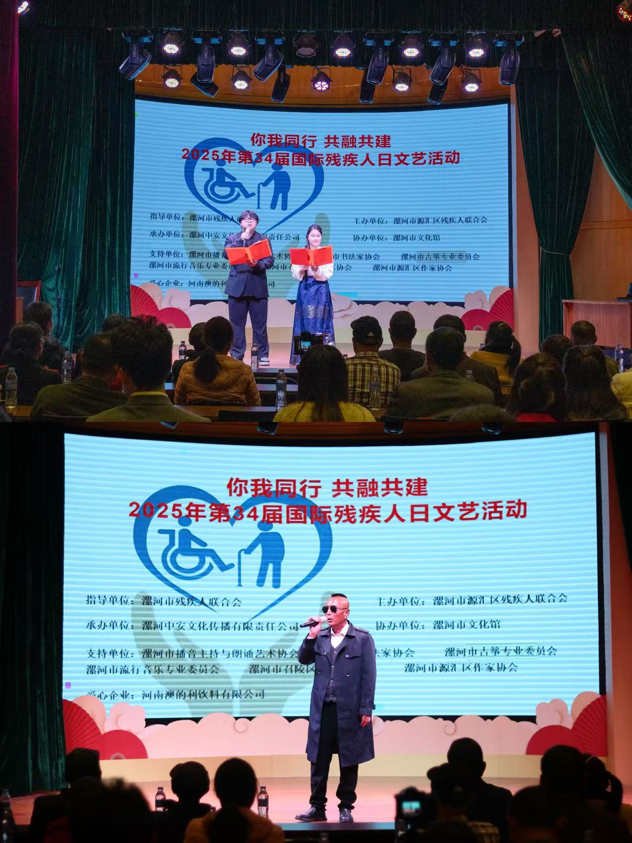 活動現(xiàn)場,文藝展演精彩紛呈、暖意融融。廿一弦古箏社李巖帶來古箏演奏《這世界這么多人》,清泉般的旋律撥動人心;漯河小學(xué)學(xué)生代表劉若涵演唱《心同此愿》,用純凈歌聲傳遞共通的情感與希望;盲人樂團(tuán)崔秋紅、周運(yùn)動分別獻(xiàn)上戲曲《府門外三聲炮》與歌曲《愛的世界只有你》,展現(xiàn)出殘疾人朋友對藝術(shù)的執(zhí)著與生命的熱忱。朗誦節(jié)目同樣感染力十足,《詩意中國》《這盛世如您所愿》《相信未來》等作品,在漯河市播音主持與朗誦藝術(shù)協(xié)會成員的演繹下,既抒發(fā)了家國情懷,也傳遞了對美好生活的向往,漯河市流行音樂專業(yè)委員會代表鄭世杰演唱的《揮揮手》,更以灑脫旋律詮釋了直面人生的勇氣。