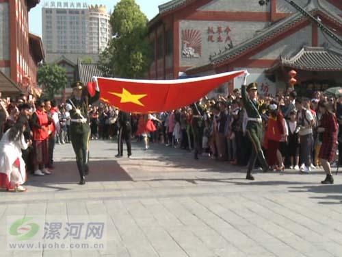 今年的青年集體婚禮,漯河市首次將“愛國文化元素”融入其中,特別邀請了天安門原國旗護(hù)衛(wèi)隊(duì)、中國第一國旗手高紅浦及戰(zhàn)友現(xiàn)場舉行升旗儀式。上午9點(diǎn),莊嚴(yán)肅穆的升國旗儀式開始,12對新人和現(xiàn)場的親朋好友在飄揚(yáng)的國旗下共唱國歌。升旗儀式結(jié)束后,高紅浦和戰(zhàn)友還給每對新人送上了一面鮮艷的五星紅旗作為新婚禮物。