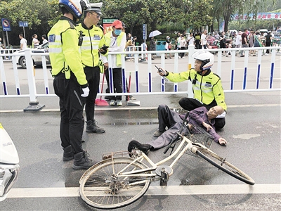 當(dāng)天上午11點20分,一名騎自行車的老人在淞江路與嵩山路交叉口附近突然暈倒,正在巡邏的騎警王孟召和2名同事恰巧路過。