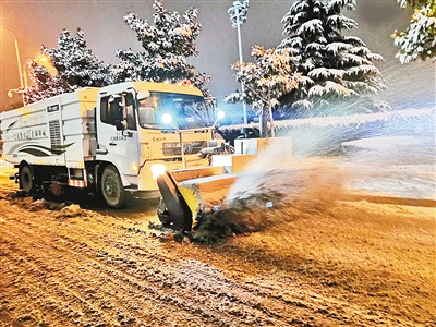 夜已深,在路燈燈光的照射下,雪花漫天飛舞。楊建和張國(guó)貞已經(jīng)把會(huì)展中心附近路面的雪清了一遍。隨后,他倆又駕車(chē)趕往下一個(gè)路段。