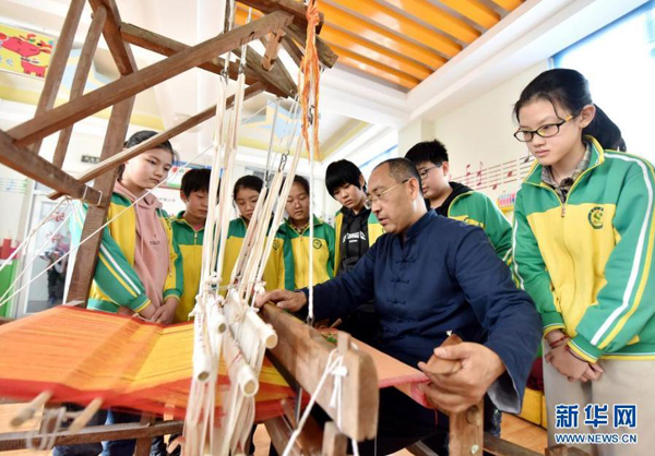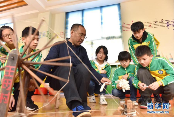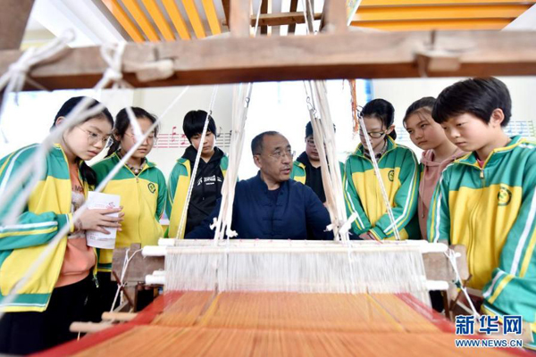 4月7日,威縣土布紡織技藝傳承人高慶海在威縣第四小學(xué)向?qū)W生演示老粗布紡織技藝。近年來,河北省邢臺市威縣積極開展“非遺傳承進校園”活動,將當(dāng)?shù)靥厣沁z項目引入學(xué)校課堂,讓學(xué)生近距離感受民間傳統(tǒng)技藝的魅力,促進非遺文化的保護和傳承。新華社記者 朱旭東 攝