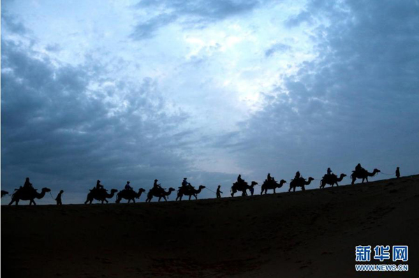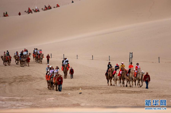 6月13日,游客在甘肅省敦煌市鳴沙山月牙泉景區(qū)游覽。