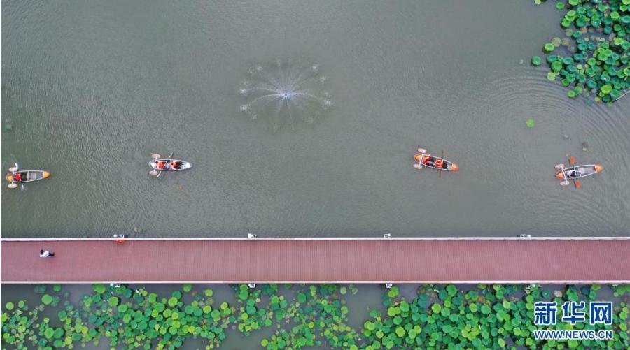 6月14日,在浙江省湖州市德清縣下渚湖國家濕地公園,游客劃船欣賞盛開的荷花(無人機照片)。