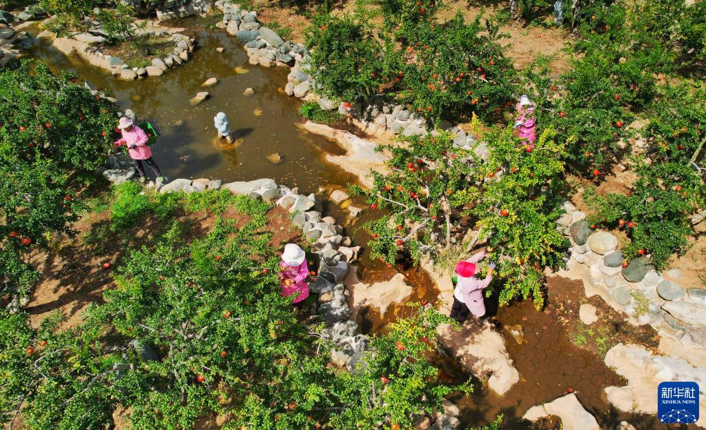 10月9日,嶧城區(qū)榴園鎮(zhèn)萬畝石榴園工人在采摘石榴(無人機照片)。