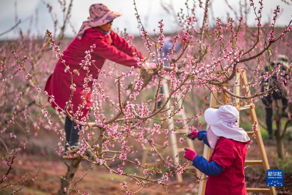 2月16日,在云南省文山市一處蜜桃基地,農(nóng)民在疏花。