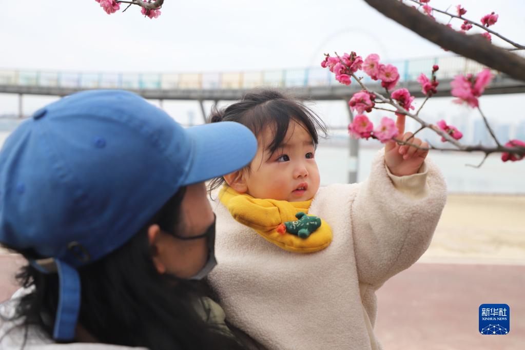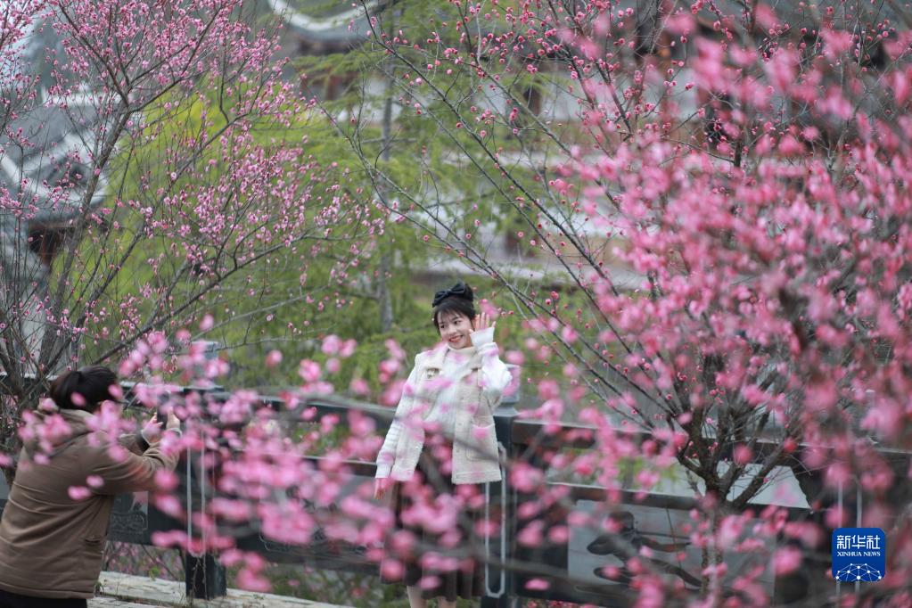 2月16日,游客在湖南省郴州市桂陽縣櫻花園賞花。