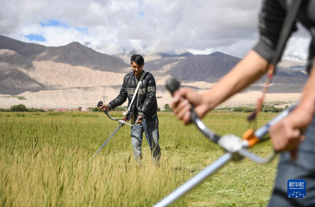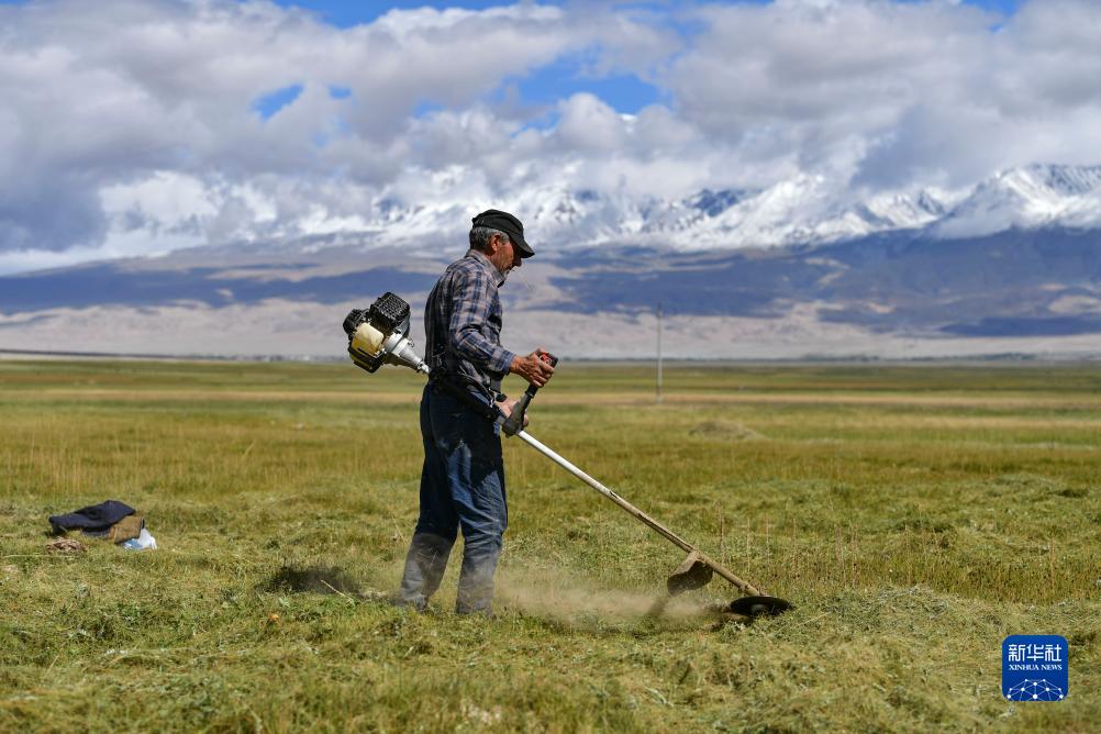 牧民在新疆塔什庫爾干塔吉克自治縣塔合曼鄉(xiāng)的草場上收割牧草(8月27日攝)。