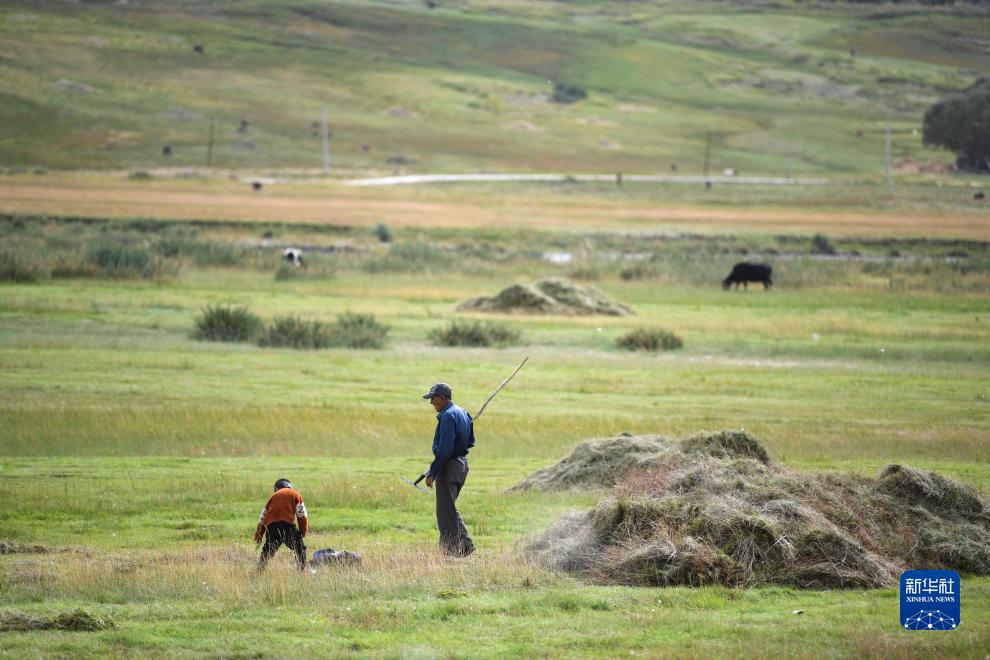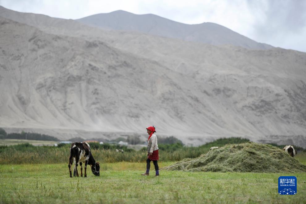 在新疆塔什庫爾干塔吉克自治縣瓦恰鄉(xiāng),打草的牧民在牧場上放牧(8月28日攝)。