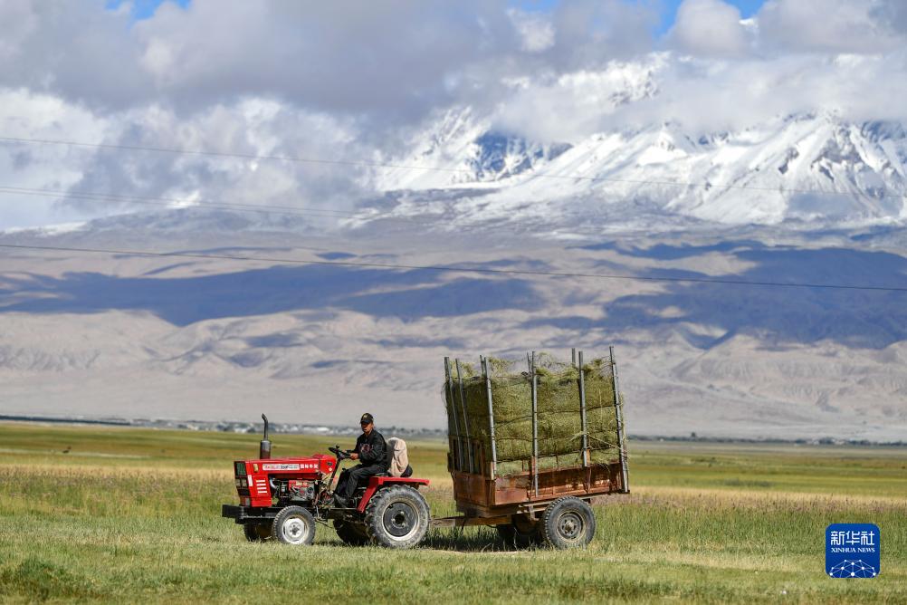 在新疆塔什庫爾干塔吉克自治縣塔合曼鄉(xiāng),牧民沙依爾開著滿載牧草的拖拉機行駛在草場上(8月27日攝)。