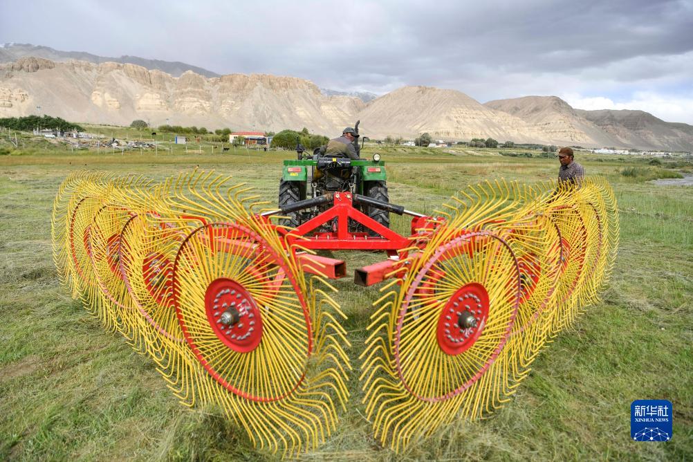 在新疆塔什庫爾干塔吉克自治縣瓦恰鄉(xiāng),牧民調(diào)試收割牧草的機械(8月28日攝)。