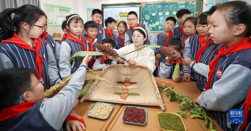 10月16日,江蘇省淮安市生態(tài)文旅區(qū)沁春路小學(xué)的老師帶領(lǐng)學(xué)生辨識糧食。