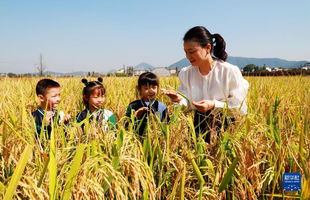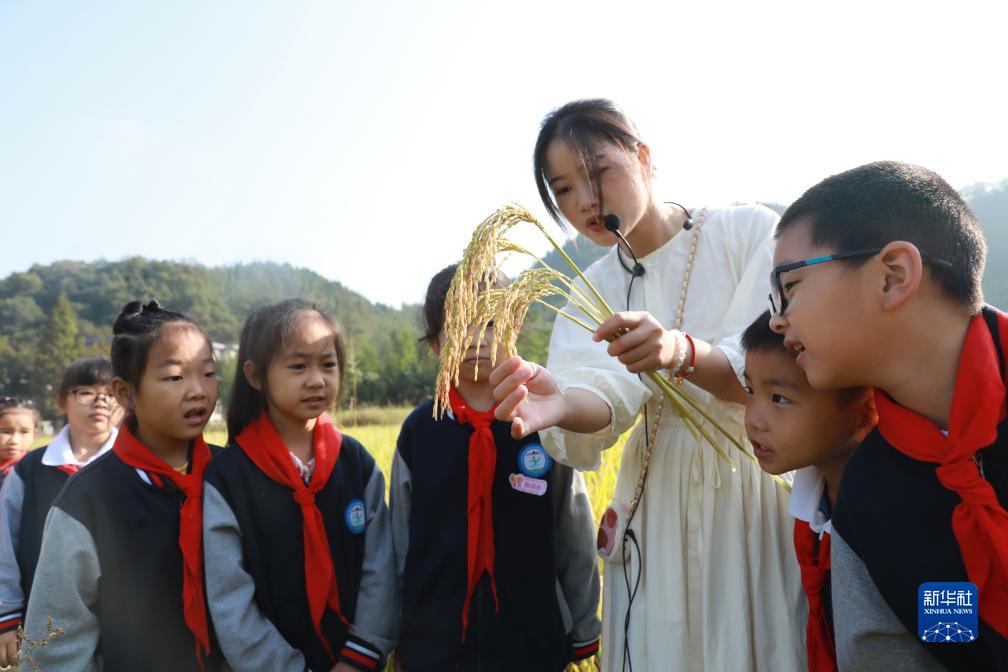 10月16日,浙江省杭州市臨安區(qū)天目山鎮(zhèn)藻溪小學(xué)學(xué)生在老師的帶領(lǐng)下學(xué)習(xí)水稻知識。