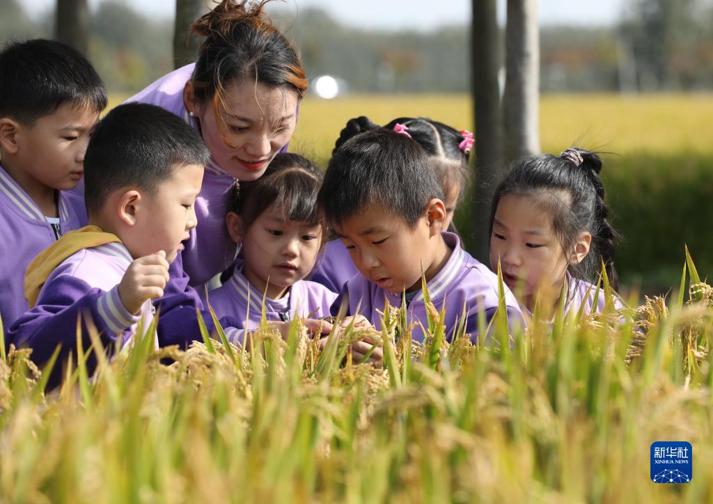 10月16日,山東省臨沂市沂南縣大莊鎮(zhèn)翔宇幼兒園的小朋友在稻田學(xué)習(xí)水稻知識。