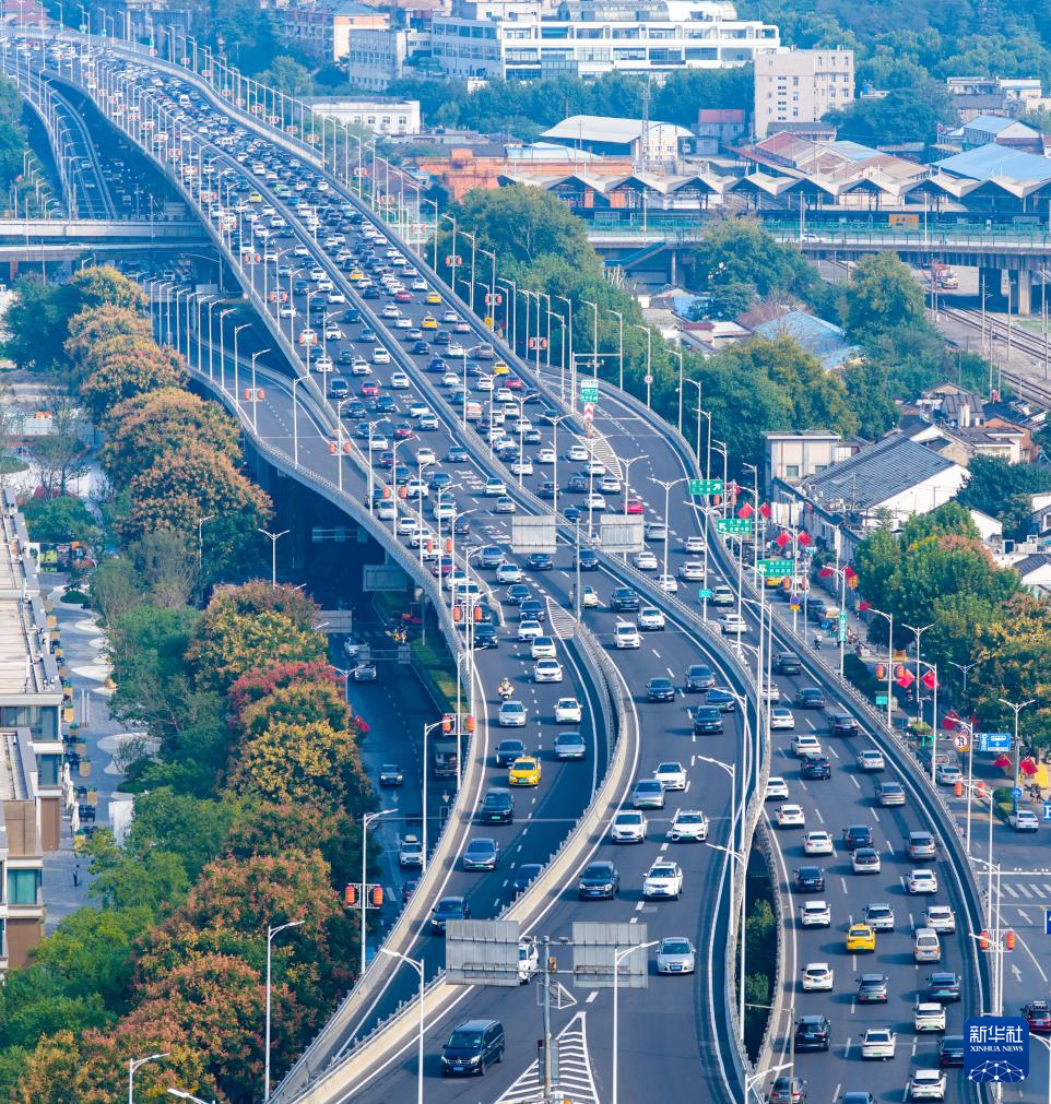10月7日,車輛行駛在江蘇省南京市應天高架上(無人機照片)。