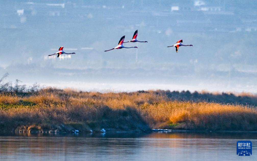 11月19日,火烈鳥在山西省運(yùn)城鹽湖濕地飛翔。
